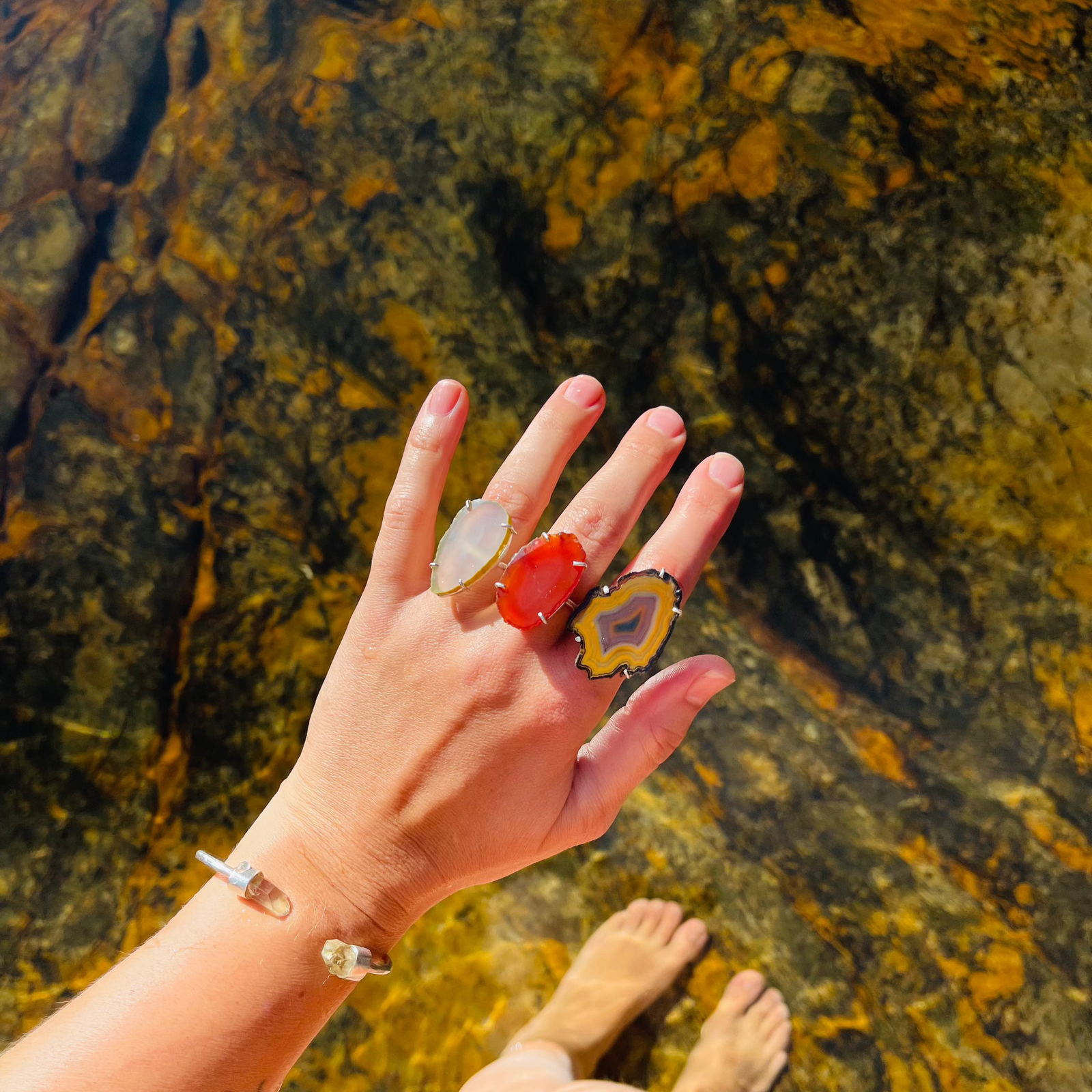 Conviver com elas e compartilhar esses amuletos surgiu pelo encantamento em uma montanha mágica, onde recebi a minha primeira e objetiva pedra, uma conexão com o Olho de tigre, não por acaso a pedra do 'eu posso, eu consigo!'. A partir desse dia, os cristais vieram para os meus dias, posso dizer que sem saber foram os meus terapeutas, e desde então não nos separamos mais, com elas as Ágatas vieram e tomaram conta, me encantando naquela delicada transparência de uma pedra bruta com seus desenhos e cores diversas, sua medicina me mostrou o equilíbrio e a partir dai o portal se abriu...
